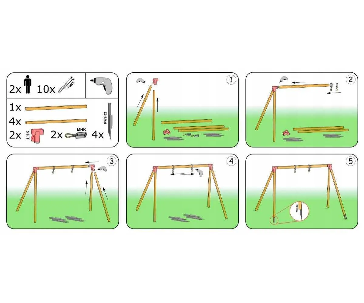 - Do budowy huśtawki potrzebne są 9 kantówek o długościach 2,5–3 m i 1–1,5 m.